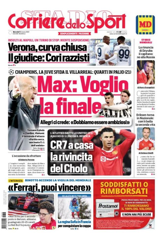 Il 'Corriere dello Sport' oggi in edicola, in prima pagina, apre con le parole di Massimiliano Allegri, tecnico della Juventus, alla vigilia della sfida odierna contro il Villarreal. I bianconeri tenteranno di approdare ai quarti di finale di Champions League, ma Max vede già oltre e, ambizioso, punta alla finale del torneo. Al turno successivo sono già finiti l'Atlético Madrid del 'Cholo', Diego Pablo Simeone ed il Benfica, che, ieri sera, hanno vinto entrambi per 1-0, rispettivamente in casa del Manchester United di Cristiano Ronaldo (ancora fuori agli ottavi dopo l'ultima volta in bianconero) e dell'Ajax. In alto, sotto la testata, si parla della chiusura della curva dell'Hellas Verona per un turno: motivo, i cori razzisti indirizzati ai tifosi del Napoli in occasione dell'ultima partita di campionato. Dall'estero, infine, due news importanti: Artem Dzyuba, attaccante dello Zenit, ha rifiutato la convocazione nella Nazionale russa poiché ha parenti in Ucraina. L'ex interista Christian Eriksen, al contrario, ritrova la Nazionale danese.