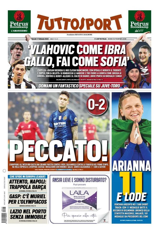 'Tuttosport' oggi in edicola, in prima pagina, commenta con un 'peccato' l'esito di Inter-Liverpool, partita di andata degli ottavi i di finale di Champions League, terminata 0-2 per gli ospiti. Una traversa di Hakan Çalhanoğlu nel primo tempo non basta. I 'Reds', nella ripresa, colpiscono con Roberto Firmino e Mohamed Salah, ipotecando la qualificazione al turno successivo. In alto, sotto la testata, si parla già di Juventus-Torino, il derby della Mole in programma domani sera all'Allianz Stadium. I protagonisti più attesi sono Dušan Vlahović, sulla sponda bianconera, e Andrea Belotti, su quella granata. Nel frattempo, però, spazio alle gare di Europa League di questa sera. Il Napoli a Barcellona, l'Atalanta in casa contro l'Olympiacos (gioca Luis Muriel) mentre la Lazio giocherà in casa del Porto senza Ciro Immobile.