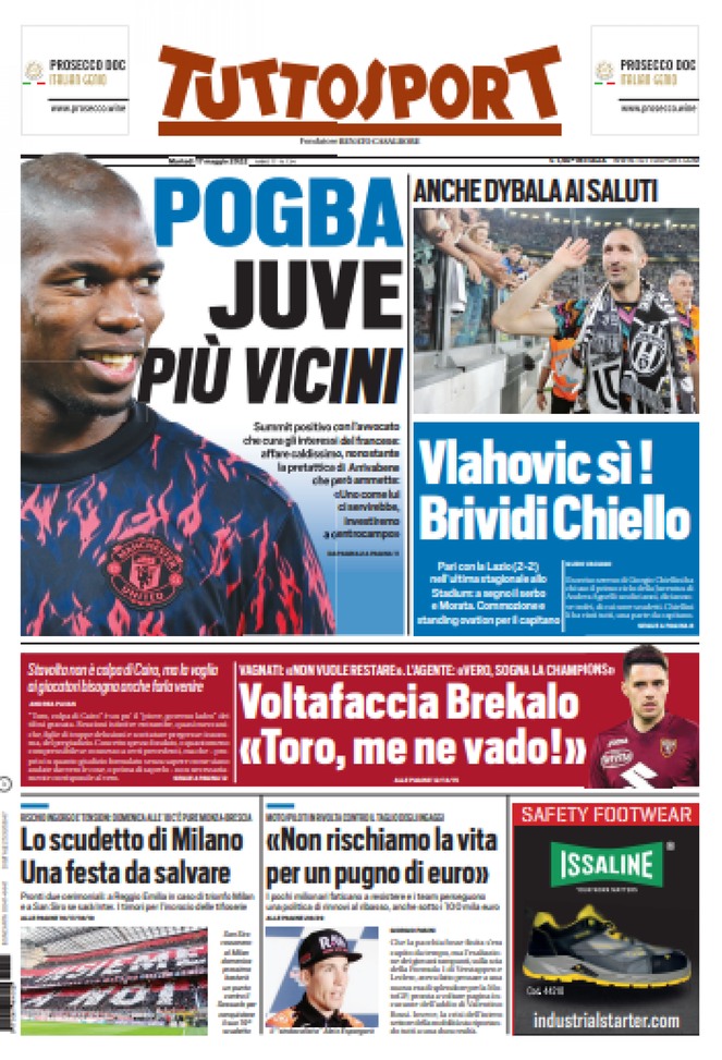 Infine, 'Tuttosport' oggi in edicola, in prima pagina, apre con parlando della trattativa di calciomercato tra la Juventus e Paul Pogba per il ritorno del centrocampista francese in bianconero. C'è fiducia: ieri summit positivo con l'entourage del giocatore che si svincolerà a parametro zero dal Manchester United. Intanto, ieri sera, in occasione di Juventus-Lazio 2-2 addio all'Allianz Stadium di Giorgio Chiellini, uscito al 17' del primo tempo, e di Paulo Dybala, in lacrime a fine partita. La bella notizia per la 'Vecchia Signora'? Il ritorno al gol di Dušan Vlahović. Incredibile in casa Torino: l'esterno offensivo croato Jošip Brekalo ha deciso di non restare in granata. Pertanto il club non potrà far valere il diritto di riscatto sul cartellino del giocatore, che tornerà al Wolfsburg per essere ceduto ad una squadra che milita in Champions League. Domenica prossima o il Milan o l'Inter vincerà lo Scudetto: ma come si svolgeranno i festeggiamenti?