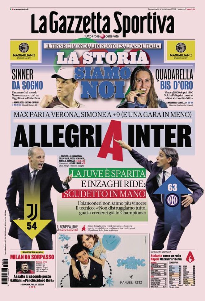 La Gazzetta dello Sport, la prima pagina di oggi, domenica 18 febbraio 2024