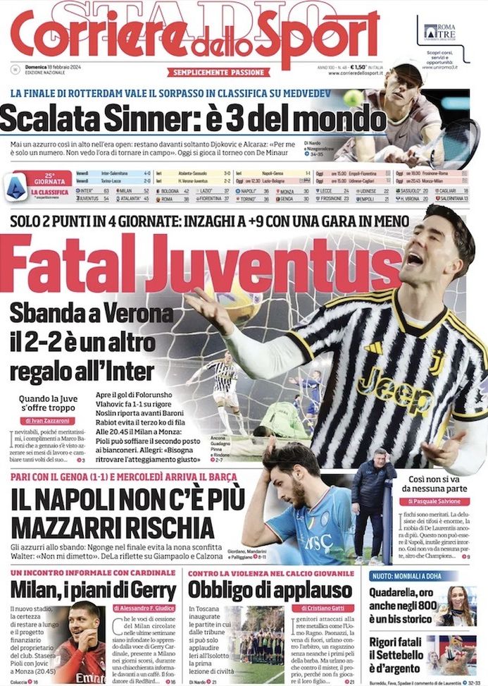 Il 'Corriere dello Sport' oggi in edicola, in prima pagina, apre commentando il pareggio, 2-2, della Juventus di Massimiliano Allegri sul campo dell'Hellas Verona di Marco Baroni. Soltanto 2 punti in 4 giornate per i bianconeri, che lanciano, di fatto, l'Inter (ora a +9 in classifica e con una partita in meno) verso il 20° Scudetto della sua storia.