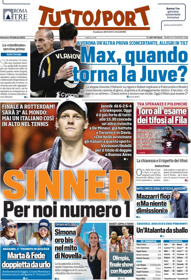 Infine, 'Tuttosport' oggi in edicola, in prima pagina, apre con un interrogativo per Massimiliano Allegri, allenatore della Juventus. "Quando tornerà la Juve?", si chiede il quotidiano torinese, visto che ieri sera, sul campo dell'Hellas Verona, i bianconeri non sono andati oltre un sofferto 2-2.