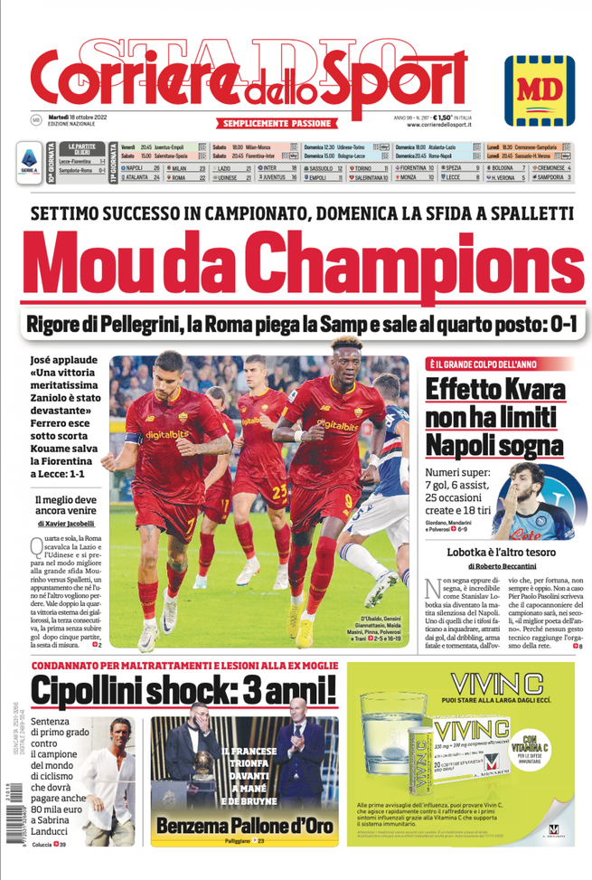 Il 'Corriere dello Sport' oggi in edicola, in prima pagina, apre con la vittoria della Roma in casa della Sampdoria in occasione di uno dei 'Monday Night' della 10^ giornata della Serie A 2022-2023. Successo di misura, 0-1, firmato da Lorenzo Pellegrini su calcio di rigore dopo pochi minuti di gioco. Giallorossi, ora, davanti a Lazio e Udinese al quarto posto in classifica, a -1 dal Milan. In Lecce-Fiorentina 1-1, invece, è Christian Kouamé a salvare i viola. A Napoli ci si interroga: ma quanto è forte Khvicha Kvaratskhelia? Il georgiano, arrivato in estate per sostituire Lorenzo Insigne, ha numeri da capogiro: 7 gol, 6 assist, 25 occasioni create e 18 tiri. Un'ira di Dio. E con lui gli azzurri sognano di poter mettere le mani sullo Scudetto. Chiosa con il Pallone d'Oro 2022: è Karim Benzema, bomber del Real Madrid, che batte Sadio Mané (Bayern Monaco) e Kevin De Bruyne (Manchester City).