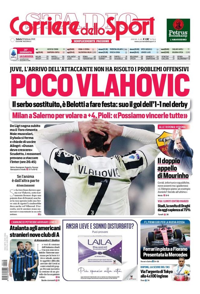 Il 'Corriere dello Sport' oggi in edicola, in prima pagina, parla della fine dell'effetto dell'acquisto Dušan Vlahović in casa Juventus. Neanche l'arrivo del micidiale bomber serbo, infatti, ha risolto i problemi offensivi dei bianconeri. Il derby contro il Torino finisce 1-1: a far festa, tra i due centravanti, è Andrea Belotti, autore della rete del pareggio per i granata. Paulo Dybala sostituito per un infortunio muscolare. Stasera, ore 20:45, c'è Salernitana-Milan e Stefano Pioli, tecnico rossonero, chiede ai suoi di tenere molto alta la concentrazione per un match sulla carta alla portata, ma di importanza capitale per volare momentaneamente a +4 sull'Inter. Prima, però, alle ore 18:00, si gioca Roma-Verona allo stadio 'Olimpico' e José Mourinho, tra infortuni e CoVid, è alle prese con ben 9 assenze! Chiusura, infine, con l'Atalanta: cessione vicina ad un fondo U.S.A., annuncio lunedì?