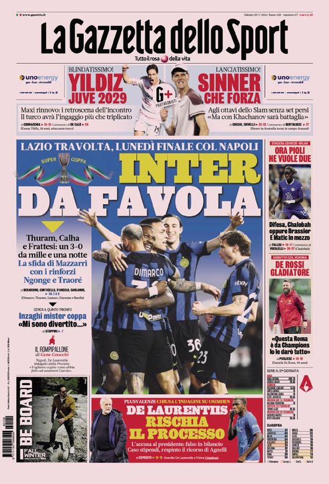 'La Gazzetta dello Sport' oggi in edicola, in prima pagina, apre parlando del 3-0 con cui l'Inter, ieri sera, a Riyadh (Arabia Saudita), ha battuto la Lazio e conquistato la finale di Supercoppa Italiana. Reti di Marcus Thuram, Hakan Çalhanoğlu su calcio di rigore e Davide Frattesi.