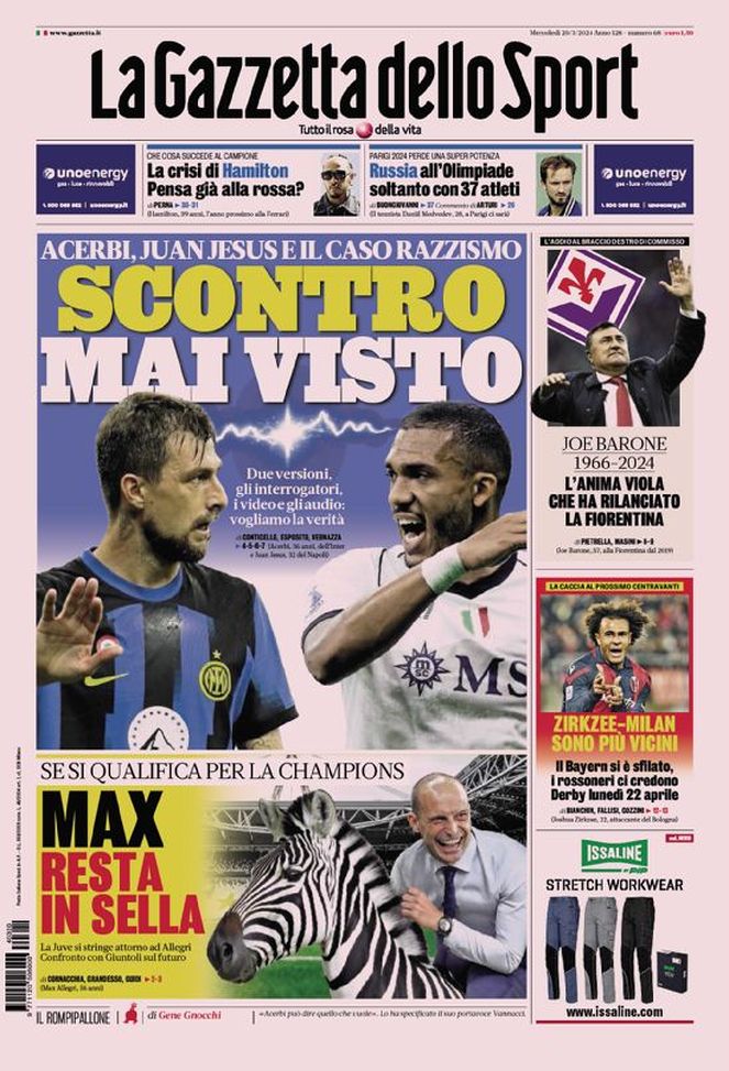 'La Gazzetta dello Sport' oggi in edicola, in prima pagina, apre parlando ancora del caso di razzismo scoppiato per gli insulti rivolti da Francesco Acerbi a Juan Jesus durante Inter-Napoli di domenica scorsa a 'San Siro'. Due versioni discordanti, interrogatori in vista, video e audio che circolano. Si chiede a gran voce che venga fatta chiarezza e detta la verità su questa storia.