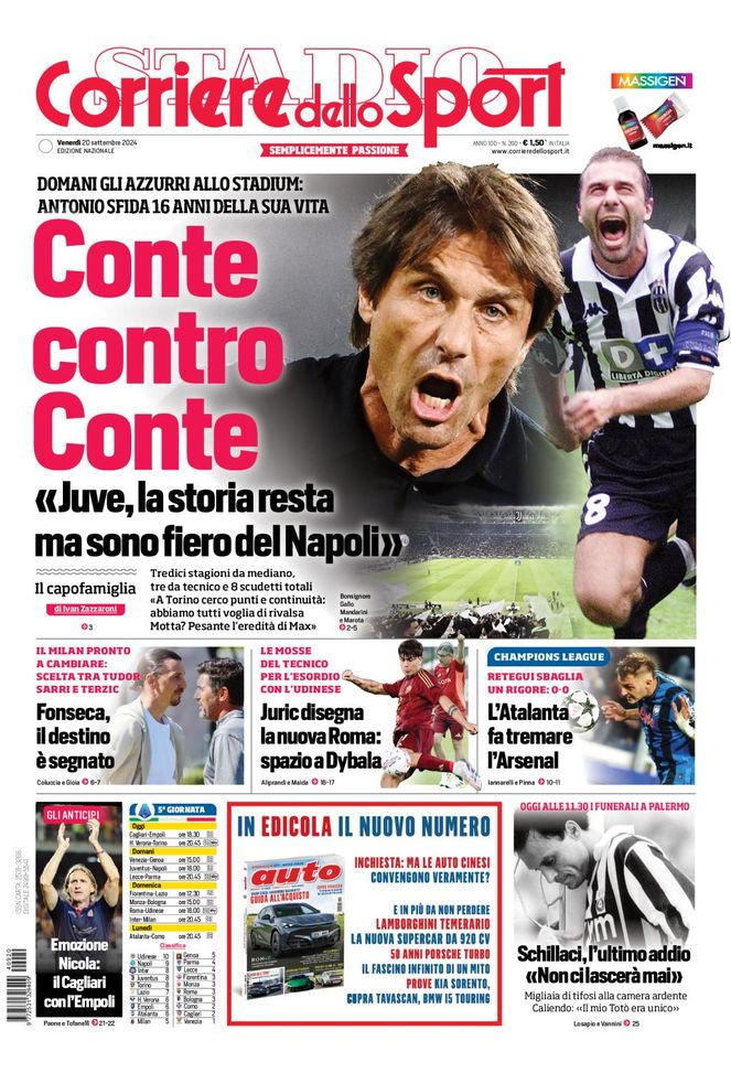 Il 'Corriere dello Sport' oggi in edicola, in prima pagina, apre parlando di Antonio Conte. Domani pomeriggio, infatti, alle ore 18:00 si disputerà Juventus-Napoli e il salentino, attuale allenatore degli azzurri, tornerà all'Allianz Stadium per sfidare 16 anni della sua storia: è stato calciatore prima e tecnico poi della 'Vecchia Signora'.