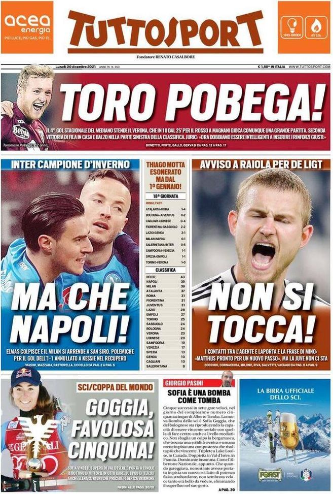 Infine, 'Tuttosport' oggi in edicola, in prima pagina, dà spazio a tre macro-argomenti. In alto, sotto la testata, la vittoria del Torino contro il Verona: l'1-0 per i granata firmato dal sempre più devastante Tommaso Pobega. Quindi, a centro pagina, il successo esterno, sempre per 1-0, del Napoli in casa del Milan: il gol di Eljif Elmas consente ai partenopei di agganciare i rossoneri al secondo posto in classifica in Serie A. Polemiche per il gol del pareggio della squadra di Stefano Pioli, giunto al 90' con Franck Kessié, poi annullato dall'arbitro Davide Massa per l'intervento del V.A.R.. Infine, si parla della Juventus e delle dichiarazioni di Mino Raiola, agente di Matthijs de Ligt. Le quali, di fatto, aprono la strada ad un trasferimento del difensore centrale olandese nel prossimo calciomercato estivo.