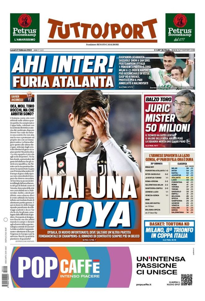 'Tuttosport' oggi in edicola, in prima pagina, apre parlando di Paulo Dybala, attaccante della Juventus. La 'Joya', infatti, ha subito un nuovo infortunio. Il numero 10 bianconero salterà, pertanto, Villarreal-Juventus di domani sera, gara d'andata degli ottavi di finale di Champions League ed anche la partita successiva di campionato. In alto, però, si parla della crisi dell'Inter di Simone Inzaghi, che ha conquistato appena un punto nelle ultime tre partite di Serie A. I nerazzurri, ieri, si sono fatti sorprendere (0-2) a 'San Siro' dal Sassuolo, fallendo il contro-sorpasso ai danni del Milan, ora a +2 in classifica. E stasera il Napoli di Luciano Spalletti, vincendo a Cagliari, supererebbe l'Inter agganciando il Diavolo in vetta. Lotta per il titolo più che mai aperta! Si parla, infine, anche del Torino di Ivan Jurić: il valore del suo parco giocatori è aumentato di 50 milioni di euro.