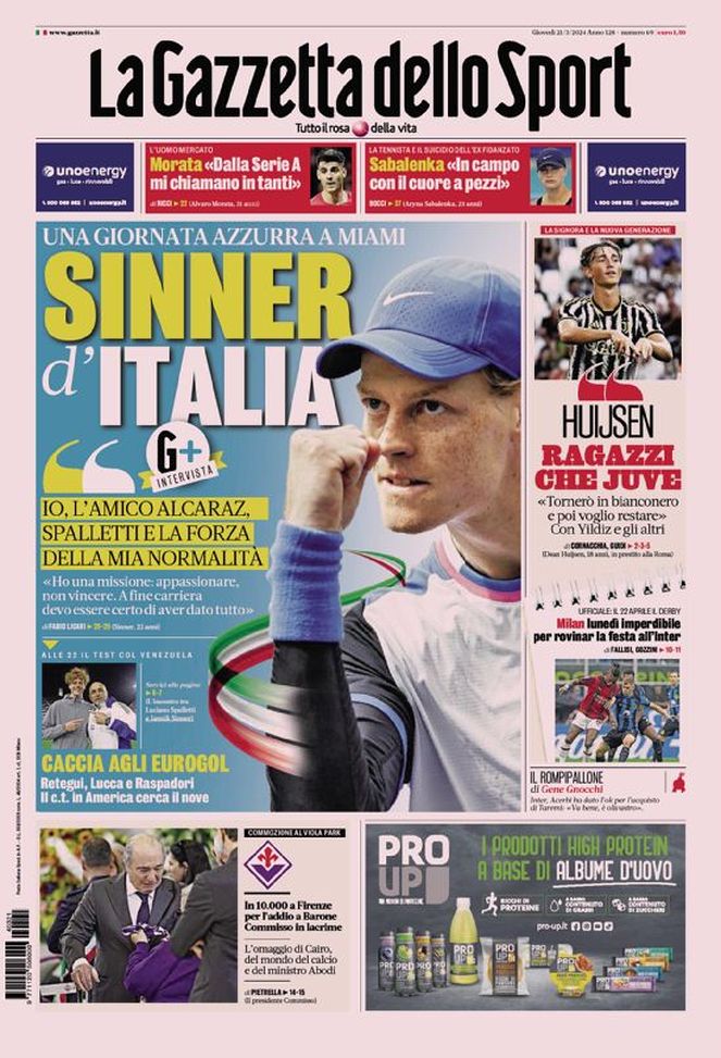 'La Gazzetta dello Sport' oggi in edicola, in prima pagina, apre con un'intervista in esclusiva a Jannik Sinner, campione italiano di tennis, il numero 3 al mondo dietro Novak Djoković e Carlos Alcaraz, attualmente a Miami (U.S.A. - Florida) per gli ATP.