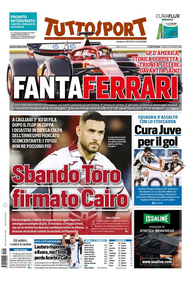 Infine, 'Tuttosport' oggi in edicola, in prima pagina, apre con la sconfitta per 3-2 del Torino di Paolo Vanoli in casa del Cagliari dell'ex Davide Nicola. Terza sconfitta di fila per il Toro tra campionato e Coppa Italia. Uno sbando, secondo il quotidiano torinese, firmato dal Presidente del sodalizio granata, Urbano Cairo.