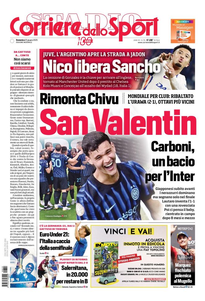 Il 'Corriere dello Sport' apre con l'Inter e con la rimonta rischiosa attuata nel match del Mondiale per Club contro gli Urawa Red Diamonds, arrivata solamente nel recupero grazie ad una rete di Valentin Carboni. Non solo, perché si parla anche del mercato della Juventus con la possibile uscita di Nico Gonzalez che aprirebbe la strada a Jadon Sancho. Infine, nella parte bassa, spazio all'Italia Under 21 che si gioca un posto in semifinale contro la Germania all'Europeo di categoria.