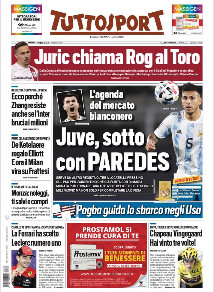 Infine, 'Tuttosport' oggi in edicola, in prima pagina, apre con l'offensiva della Juventus per il centrocampista argentino Leandro Paredes del PSG. Gli altri potenziali acquisti bianconeri sono Nikola Milenković (Fiorentina), più un attaccante tra Álvaro Morata (Atlético Madrid), Marko Arnautovic (Bologna) e Andrea Belotti (svincolato). Inizia stanotte la tournée statunitense della 'Vecchia Signora'. In alto, sotto la testata, spazio al calciomercato del Torino: il tecnico croato Ivan Jurić 'chiama' sotto la Mole il suo connazionale Marko Rog, retrocesso in Serie B con il Cagliari. Spunta l'opzione Mickaël Cuisance del Venezia, mentre in difesa è attesa per Jason Denayer. All'Inter il Presidente Steven Zhang resiste anche se in evidenti difficoltà economica, mentre il Milan aspetta il sì dal Bruges per Charles De Ketelaere. E, intanto, i rossoneri si informano per Davide Frattesi del Sassuolo. Chiosa con il Monza: un mercato super, tutto fatto di giocatori da riscattare in caso di salvezza.
