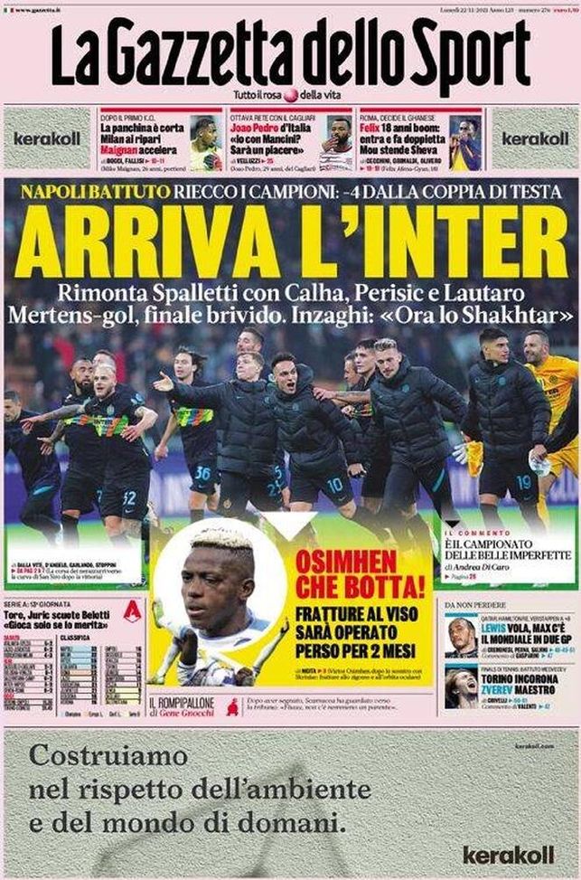 'La Gazzetta dello Sport' oggi in edicola, in prima pagina, apre con il successo (3-2) dell'Inter sul Napoli. Tre punti che portano i nerazzurri a -4 dagli stessi azzurri e dal Milan, che guidano la classifica di Serie A. Brutto incidente per Victor Osimhen, che dovrà stare fuori 2 mesi: sarà operato per delle fratture al viso. I rossoneri di Stefano Pioli, probabilmente, ritroveranno Mike Maignan prima del previsto, ma devono fare i conti con la panchina corta. Intanto, a Cagliari il brasiliano João Pedro, che ha la cittadinanza italiana, spera in una chiamata da parte del Commissario Tecnico Roberto Mancini. Brutto esordio, infine, di Andriy Shevchenko sulla panchina del Genoa: sconfitta 0-2 a 'Marassi' contro la Roma di José Mourinho, con doppietta del giovane Felix Afena-Gyan.