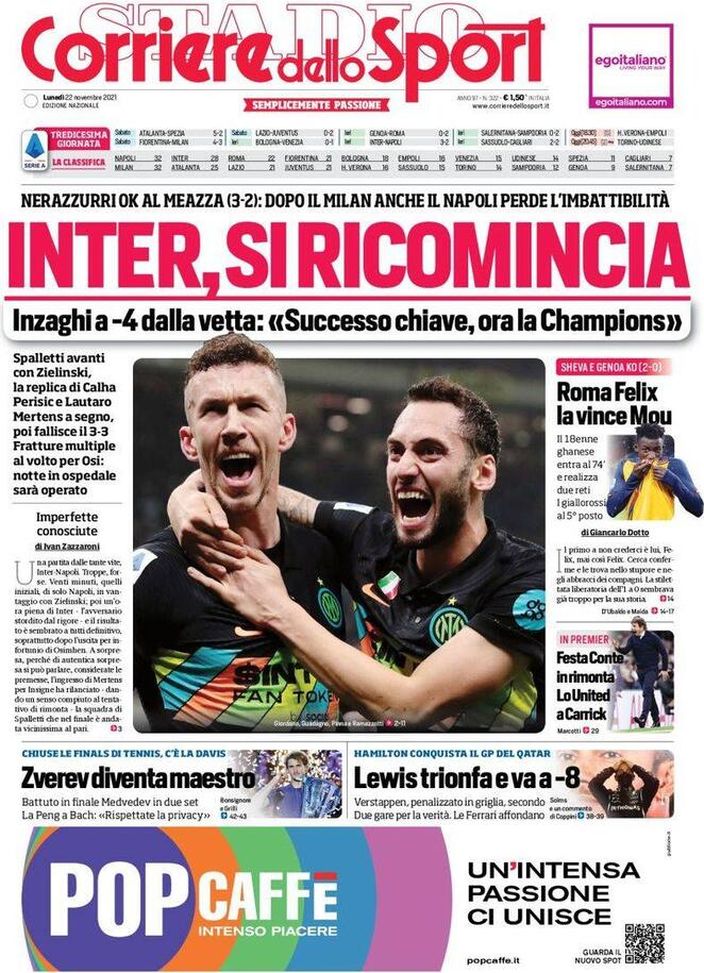 Il 'Corriere dello Sport' oggi in edicola, in prima pagina, apre celebrando la vittoria dell'Inter di Simone Inzaghi contro il Napoli di Luciano Spalletti. Il 3-2 di 'San Siro', di fatto, rimette i nerazzurri pienamente in corsa per lo Scudetto. Fratture multiple al viso per Victor Osimhen, che dovrà fermarsi presumibilmente per due mesi. Colpo esterno della Roma (0-2) in casa del Genoa: doppietta di Felix Afena-Gyan nel finale e primo k.o. da tecnico rossoblu per Andriy Shevchenko. In Premier League, primo successo per Antonio Conte sulla panchina del Tottenham (2-1 sul Leeds United), mentre il Manchester United, che ha esonerato Ole Gunnar Solskjær, ha affidato per ora la conduzione tecnica della Prima Squadra a Michael Carrick.