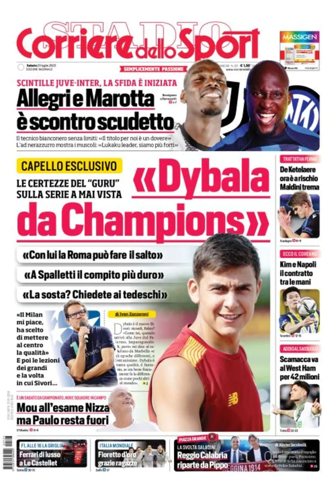 La prima pagina del 'Corriere dello Sport', in edicola oggi, 23-07-2022