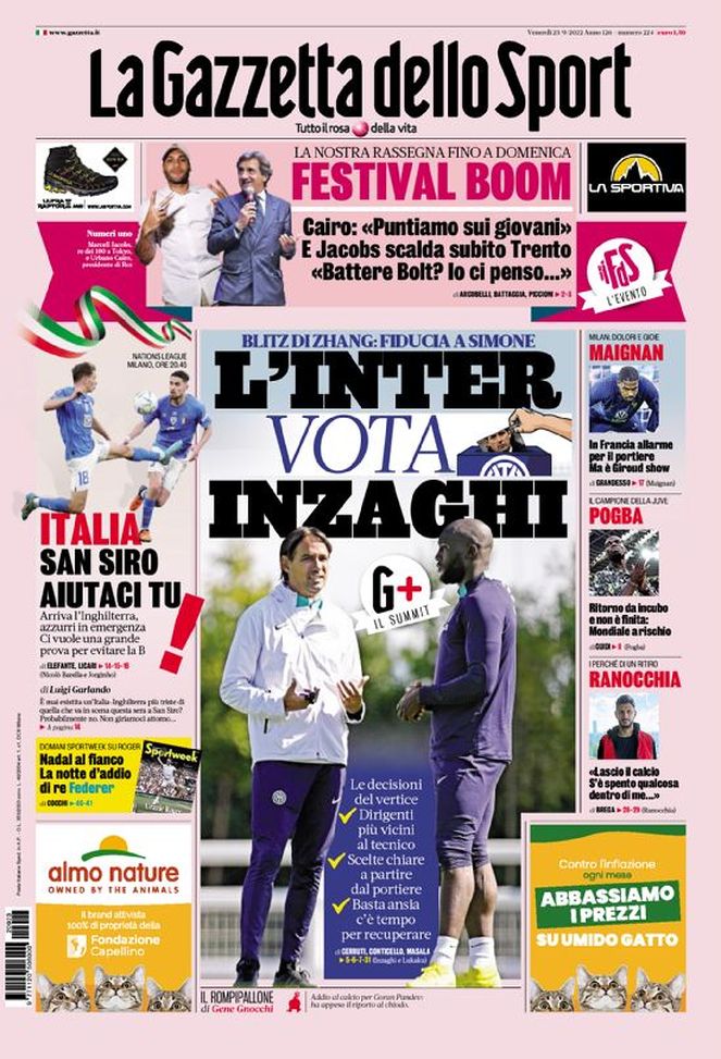 La Gazzetta dello Sport' oggi in edicola, in prima pagina, apre con il rinnovo della fiducia in casa Inter per il tecnico Simone Inzaghi. Festival dello Sport: Cairo predica la fiducia nei giovani. Milan: le condizioni di Maignan e lo show di Giroud a segno anche nella gara di ieri. Italia: arriva l'Inghilterra, servirà una grande partita. Infine, Mondiali a rischio per Pogba ed il ritiro di Ranocchia.