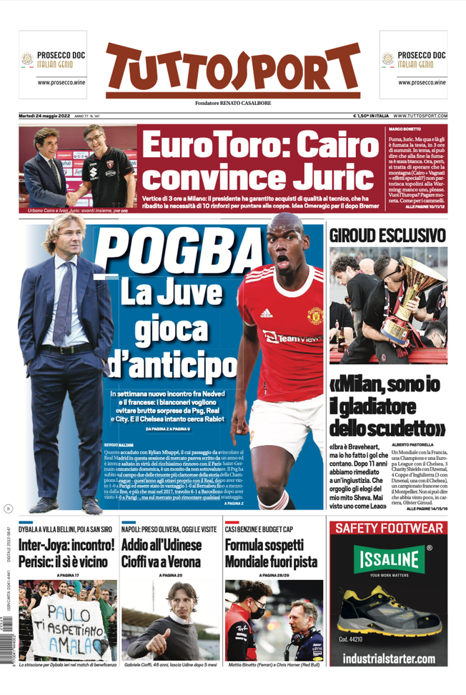 Infine, 'Tuttosport' oggi in edicola, in prima pagina, apre con le ultime news sul possibile ritorno di Paul Pogba alla Juventus. In settimana ci sarà un nuovo incontro, infatti, tra il vicepresidente bianconero Pavel Nedved e l'entourage del calciatore. La 'Vecchia Signora' vuole bruciare la possibile concorrenza e chiudere per il 'Polpo'. Ieri sera, a 'San Siro', il pubblico interista ha acclamato Paulo Dybala: spinge per avere la 'Joya', che si svincolerà dalla Juve, in maglia nerazzurra. L'Inter, intanto, è vicina ad incassare il sì di Ivan Perišić all'ultima offerta di rinnovo del contratto. In alto, sotto la testata, la situazione in casa Torino, con il Presidente Urbano Cairo che sembra aver convinto il tecnico Ivan Jurić sulla bontà del progetto granata per la prossima stagione. Ha parlato, quindi, Olivier Giroud, bomber del Milan, in esclusiva al quotidiano torinese: si sente il gladiatore dello Scudetto rossonero. Iniziato il valzer delle panchine: Gabriele Cioffi lascia l'Udinese e va all'Hellas Verona.