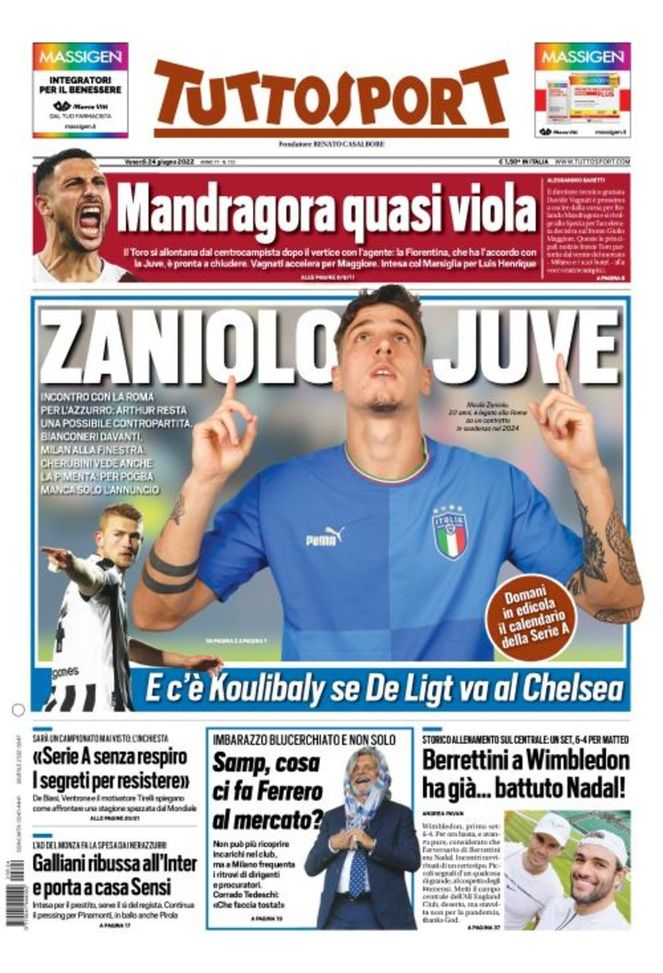 Infine 'Tuttosport' oggi in edicola, in prima pagina, apre con la possibilità, concreta, che Nicolò Zaniolo approdi alla Juventus in questo calciomercato estivo. I bianconeri hanno infatti incontrato la Roma: possibile contropartita tecnica, il brasiliano Arthur. La 'Vecchia Signora', ora, è in pole position per il nazionale italiano. Con il Milan, però, che resta alla finestra per lui. Per il ritorno di Paul Pogba alla Juve manca solo l'annuncio, mentre Kalidou Koulibaly potrebbe sostituire Matthijs de Ligt alla corte di Massimiliano Allegri qualora l'olandese andasse al Chelsea. In alto, sotto la testata, si parla del Torino, che sta per perdere Rolando Mandragora, vicino alla Fiorentina. Scatenato il Monza di Adriano Galliani: prende in prestito Stefano Sensi dall'Inter.