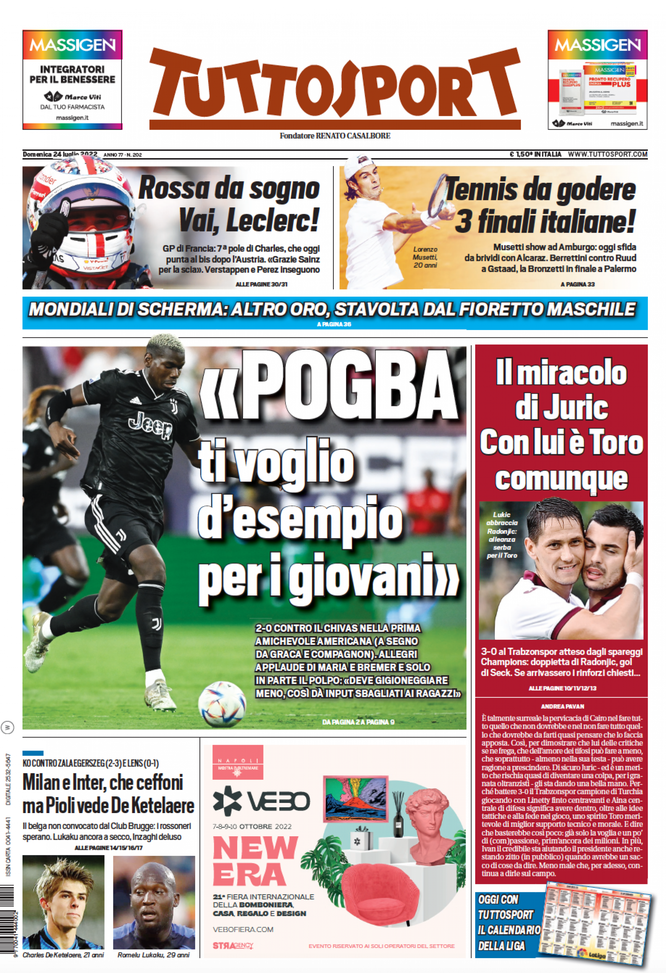 Infine, 'Tuttosport' oggi in edicola in prima pagina apre con le dichiarazioni di Massimiliano Allegri, allenatore della Juventus, dopo il 2-0 rifilato al Chivas nelle prima amichevole della tourneé statunitense dei bianconeri. In particolare, il tecnico si è soffermato sull'importanza di Paul Pogba nella squadra. Spazio, però, anche bella vittoria, 3-0, del Torino di Ivan Jurić sui turchi del Trabzonspor, attesi dagli spareggi per entrare in Champions League: in gol, due volte, Nemanja Radonjić, poi Demba Seck. Cadute invece, per Milan, superato per 2-3 dallo ZTE in Ungheria (ma è in arrivo Charles De Ketelaere ...) e Inter, battuta 0-1 nel finale contro il Lens. Ancora a secco di reti Romelu Lukaku.