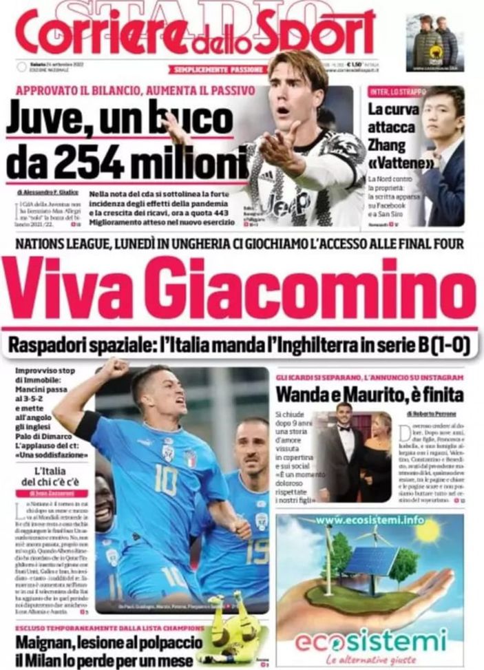 Il 'Corriere dello Sport' oggi in edicola, in prima, apre parlando di Italia-Inghilterra 1-0, partita di Nations League decisa al 68' da un gran gol di Giacomo Raspadori, attaccante del Napoli. Con questi tre punti gli Azzurri possono ancora aspirare alle Final Four di Nations League: servirà, però, vincere a Budapest contro l'Ungheria lunedì sera. In alto, sotto la testata, si parla dei problemi di Juventus e Inter. I bianconeri hanno un buco di bilancio, al 30 giugno 2022, di 254 milioni di euro: ci si aspetta, però, un miglioramento nell'esercizio successivo. Il Presidente dei nerazzurri, Steven Zhang, è invece oggetto di critiche da parte dei tifosi della Curva Nord, che spingono per l'addio dell'imprenditore cinese. Il Milan perde per un mese Mike Maignan, che si è lesionato il polpaccio in occasione di Francia-Austria di Nations League: il portiere escluso temporaneamente dalla lista per la Champions League. Gossip: è ufficiale la separazione tra Wanda Nara e Mauro Icardi.