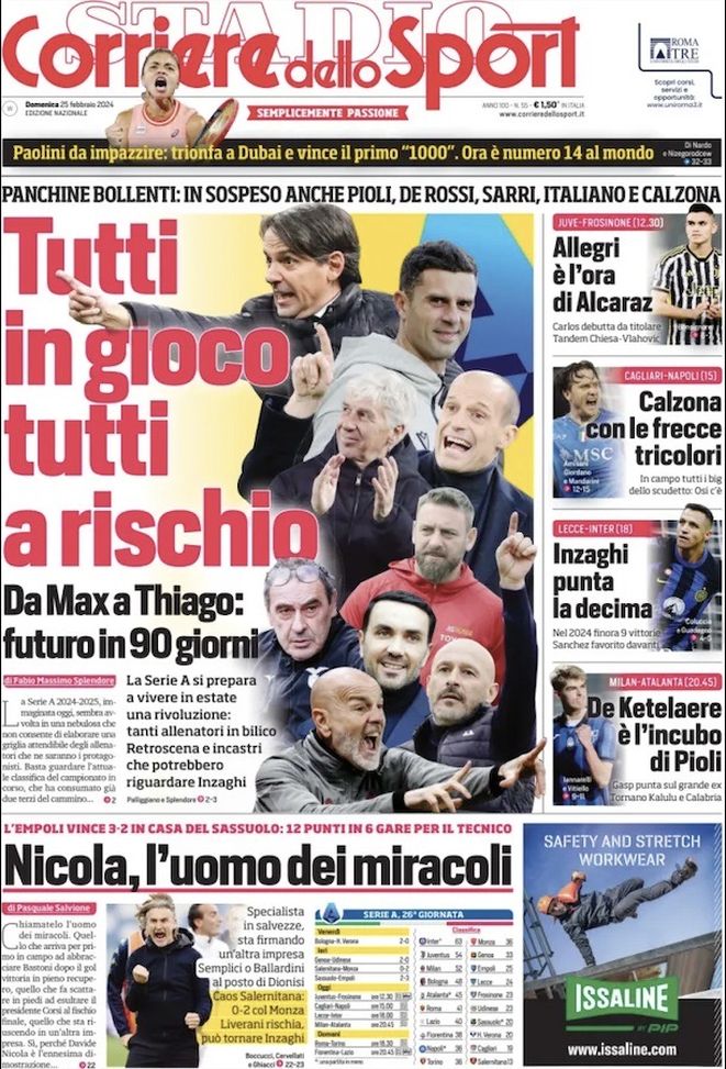 Da Massimiliano Allegri (Juventus) a Francesco Calzona (Napoli), occhio anche al futuro di Stefano Pioli (Milan), Gian Piero Gasperini (Atalanta), Thiago Motta (Bologna), Daniele De Rossi (Roma) e Maurizio Sarri (Lazio). L'uomo dei miracoli, intanto, si chiama Davide Nicola. Da quando è arrivato ha risollevato l'Empoli.