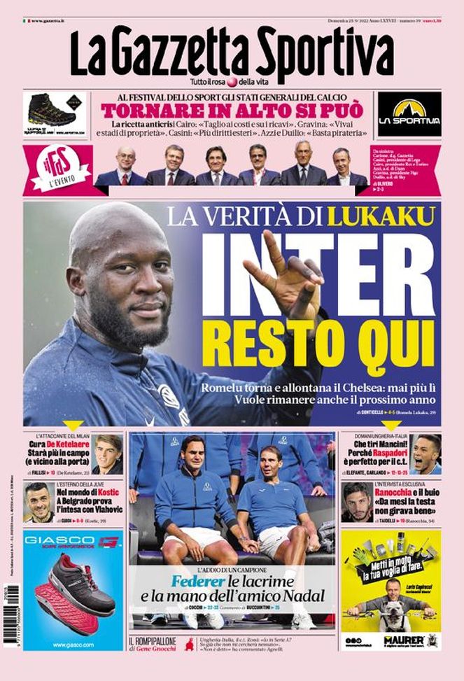 'La Gazzetta dello Sport' oggi in edicola, in prima pagina, apre con la voglia di Romelo Lukaku di restare all'Inter anche l'anno prossimo. In taglio alto la ricetta anti crisi per il calcio italiano. Spazio anche per la Nazionale italiana con Raspadori e per il ritiro di Andrea Ranocchia. Presenti Milan e Juventus con due approfondimenti sui due neo acquisti De Ketelaere e Kostic. Non manca un omaggio a Roger Federer con la sua ultima partita in Laver Cup disputata in doppio con lo storico rivale Rafael Nadal.