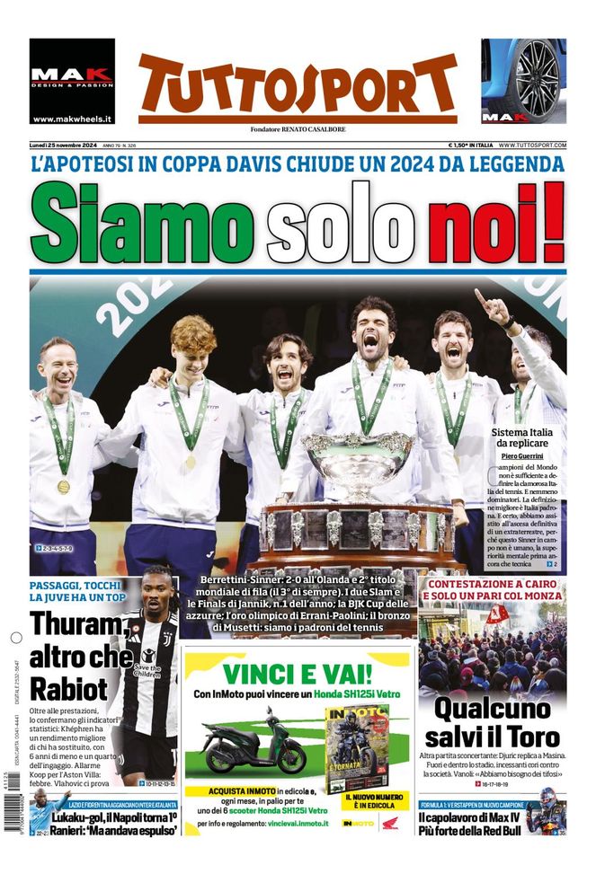 Infine, 'Tuttosport' oggi in edicola, in prima pagina, apre parlando di tennis e della vittoria, la seconda consecutiva, dell'Italia nella Coppa Davis. Battuta 2-0 l'Olanda in finale grazie a Matteo Berrettini e Jannik Sinner. Azzurri padroni assoluti in questo 2024 da leggenda.