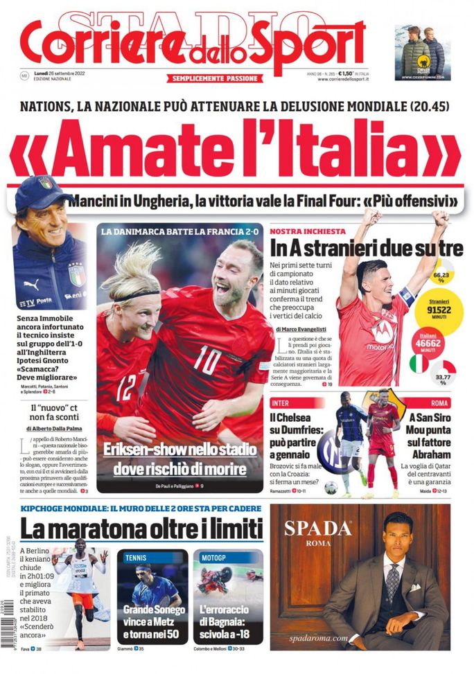 Il 'Corriere dello Sport' oggi in edicola, in prima pagina, apre con le parole di Roberto Mancini, Commissario Tecnico azzurro, alla vigilia di Ungheria-Italia. Per il C.T., la Nazionale andrebbe amata un po' di più. Intanto, stasera a Budapest, gli Azzurri hanno la possibilità, vincendo, di approdare alle final four di Nations League. Ieri sera, al 'Parken' di Copenhagen, show di Christian Eriksen, nello stadio in cui rischiò di morire, in occasione di Danimarca-Francia 2-0. Inchiesta del quotidiano romano che rivela come, nella nostra Serie A, giochino addirittura 2 stranieri su 3 calciatori. Spazio, poi, all'Inter, che perde Marcelo Brozović per infortunio durante Austria-Croazia (si parla di un mese di stop) e, probabilmente, cederà Denzel Dumfries al Chelsea durante il calciomercato di gennaio. Quindi la Roma, che giocherà proprio a 'San Siro' contro i nerazzurri alla ripresa del campionato: per vincere a 'San Siro' José Mourinho punta sulla voglia di riscatto di Tammy Abraham.