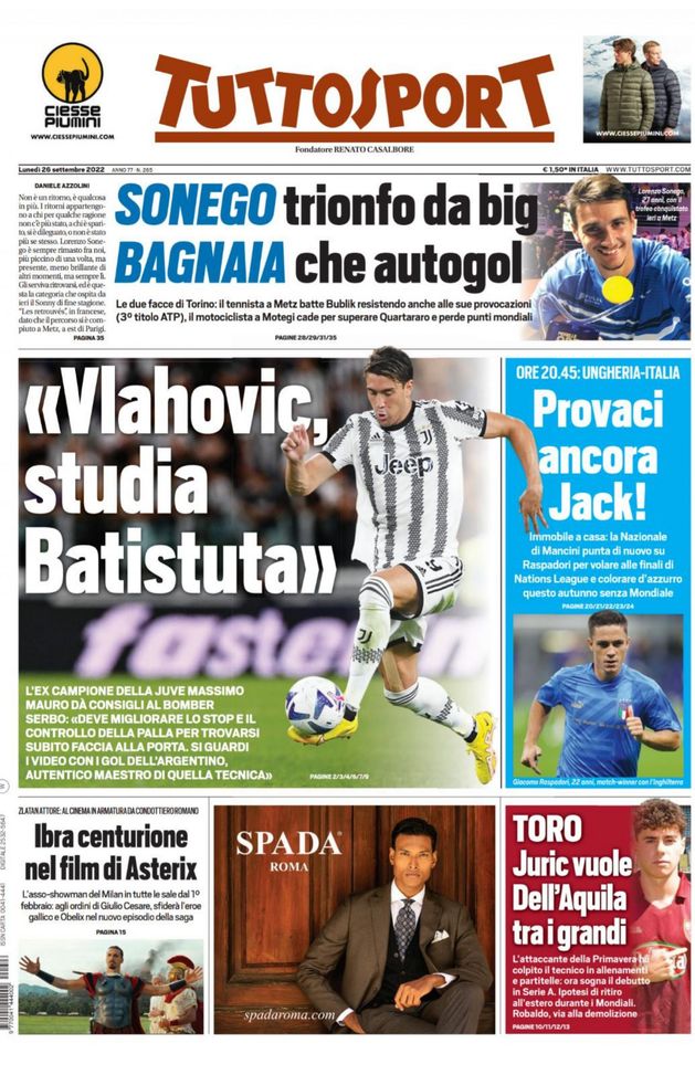 Infine, 'Tuttosport' oggi in edicola, in prima pagina, apre con l'intervista in esclusiva a Massimo Mauro, ex centrocampista della Juventus, che parla di Dušan Vlahović, attaccante della 'Vecchia Signora'. Consigliandogli di guardare tanti video di Gabriel Omar Batistuta, ex centravanti di Fiorentina, Roma e Inter, per migliorare nei fondamentali e nel modo di giocare. Si parla, quindi, di Ungheria-Italia, in programma stasera alle ore 20:45 a Budapest: in caso di vittoria, gli Azzurri andrebbero a giocarsi le final four di Nations League. L'attaccante svedese Zlatan Ibrahimović, bomber del Milan, sarà presto al cinema, nel ruolo di centurione, nell'ultimo film di Asterix e Obelix: appuntamento dal 1° febbraio 2023! In chiusura, il Torino: il tecnico Ivan Jurić avrebbe in mente di promuovere Francesco Dell'Aquila, attaccante della Primavera granata, in pianta stabile in Prima Squadra.