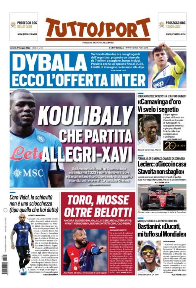 Infine, 'Tuttosport' oggi in edicola, in prima pagina, apre parlando di Kalidou Koulibaly, forte difensore centrale senegalese in uscita dal Napoli e nel mirino, per l'imminente sessione estiva di calciomercato, sia della Juventus di Massimiliano Allegri sia del Barcellona di Xavi. In alto, sotto la testata, si parla dell'offerta di contratto dell'Inter a Paulo Dybala: triennale (scadenza 30 giugno 2025) da 7 milioni di euro a stagione bonus inclusi, con opzione per il prolungamento fino al 2026. Quindi, spazio alla presentazione di Eduardo Camavinga, gioiello del Real Madrid e allo sfogo di Arturo Vidal, centrocampista dell'Inter, sulle troppe partite che si giocano oggi in una stagione. Chiusura con il mercato del Torino: nuovi contatti per prendere João Pedro dal Cagliari, retrocesso in Serie B.