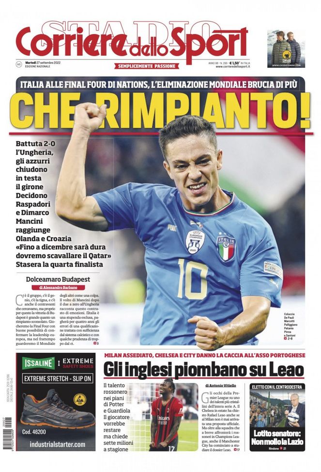 Il 'Corriere dello Sport' oggi in edicola, in prima pagina, apre parlando di Ungheria-Italia 0-2, ultima partita del nostro girone di Nations League. In virtù della vittoria a Budapest, vidimata dalle reti di Giacomo Raspadori nel primo tempo e Federico Dimarco nella ripresa, gli Azzurri accedono alle final four del torneo raggiungendo Olanda e Croazia. Stasera si conoscerà il nome della quarta finalista. Il rimpianto, secondo il 'CorSport', di non partecipare ai Mondiali in Qatar ora si acuisce ancora di più. Claudio Lotito, Presidente della Lazio, è stato eletto in Senato con il centrodestra alle ultime Elezioni Amministrative: ha già fatto sapere, però, di non voler cedere la società biancoceleste. Trema, invece, il Milan perché nella sessione invernale di calciomercato le big inglesi Chelsea e Manchester City torneranno alla carica per Rafael Leão. Il Diavolo vorrebbe trattenerlo e rinnovargli il contratto attualmente in scadenza il 30 giugno 2024, ma il giocatore chiede ben 7 milioni di euro netti a stagione.