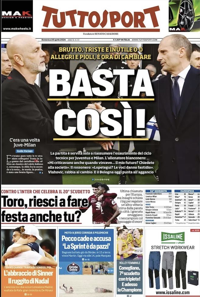 Infine, 'Tuttosport' oggi in edicola, in prima pagina, parla di Juventus-Milan, partita della 34^ giornata della Serie A 2023-2024, andata in scena ieri pomeriggio all'Allianz Stadium e finita 0-0. Gara brutta, che non ha fatto altro che certificare l'esaurimento del ciclo tecnico di Massimiliano Allegri e Stefano Pioli con bianconeri e rossoneri.