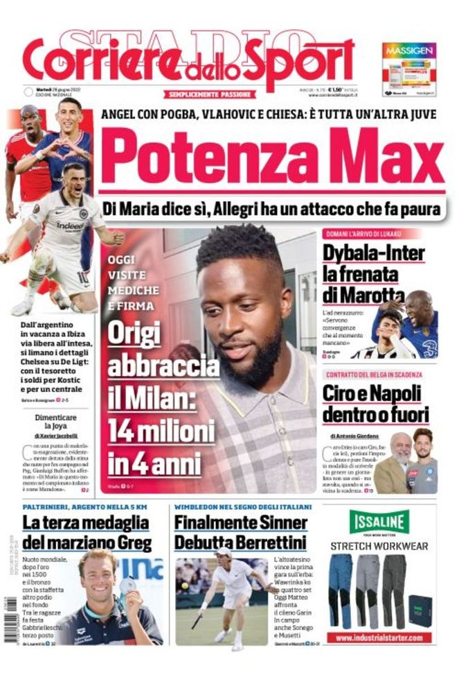 Il 'Corriere dello Sport' oggi in edicola, in prima pagina, ha aperto soffermandosi sulla Juventus. Il tridente d'attacco bianconero, con Ángel Di María, Dušan Vlahović e Federico Chiesa, avrà tutta un'altra potenza di fuoco in vista della stagione 2022-2023. Intanto il Milan abbraccia Divock Origi, sbarcato ieri sera all'aeroporto di Malpensa: oggi visite mediche e firma sul contratto con il Diavolo. Percepirà 14 milioni di euro fino al 30 giugno 2026. Frenata dell'Inter su Paulo Dybala: le parole dell'amministratore delegato nerazzurro, Giuseppe Marotta, non lasciano spazio ad interpretazioni. A Napoli è in scadenza il contratto del miglior marcatore di tutti i tempi della storia azzurra, Dries Mertens: ultimi giorni per capire se il belga rinnoverà con il club di Aurelio De Laurentiis o se farà altre scelte.
