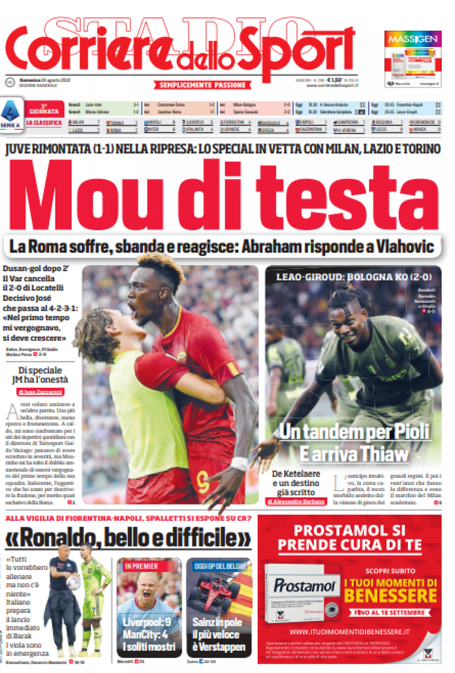 Il 'Corriere dello Sport' oggi in edicola, in prima pagina, apre parlando del pareggio tra Juventus e Roma all'Allianz Stadium. I giallorossi di José Mourinho vanno sotto subito per merito di una punizione magistrale realizzata da Dušan Vlahović. Primo tempo brutto della squadra capitolina. Poi, però, nella ripresa la reazione che porta al meritato pari realizzato da Tammy Abraham. Spazio, però, anche al Milan di Stefano Pioli, che batte 2-0 il Bologna a 'San Siro'. Rafael Leão prima segna sfruttando il primo assist italiano di Charles De Ketelaere, poi offre a Olivier Giroud il pallone del raddoppio. A Napoli, intanto, c'è la possibilità di portare Cristiano Ronaldo, in uscita dal Manchester United e il tecnico Luciano Spalletti non ha nascosto come l'opzione lo intrighi molto. A proposito di Premier League: netto 9-0 del Liverpool sul Bournemouth, mentre vince 4-2 in rimonta il Manchester City contro il Crystal Palace. Prima tripletta inglese per Erling Braut Haaland.