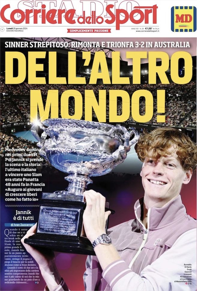 Il 'Corriere dello Sport' oggi in edicola ha dedicato la sua intera prima pagina di oggi al trionfo di Jannik Sinner agli Australian Open di tennis. L'italiano ha sofferto nei primi due set contro il russo Daniil Medvedev, andando sotto: poi la rimonta fino al 3-2 definitivo nella finale di Melbourne. Sinner, così, è entrato nella storia: un nostro connazionale, infatti, non vinceva lo Slam dal 1976, quando ci riuscì Adriano Panatta in Francia. Sulla copertina del 'CorSport', poi, il commento di Sinner dopo la vittoria (con tanto di ringraziamento ai suoi genitori) e l'editoriale del direttore del quotidiano, Ivan Zazzaroni.
