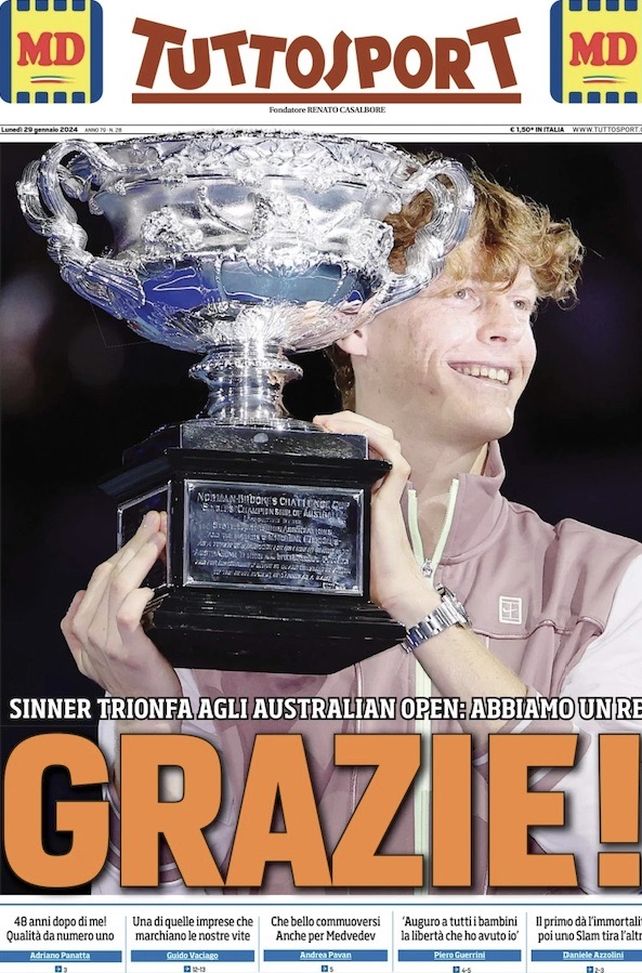 Infine, 'Tuttosport' oggi in edicola ha parlato, nella sua prima pagina di oggi, unicamente di Jannik Sinner. Clamorosa vittoria, in rimonta, per 3-2 nella finale degli Australian Open di tennis contro il russo Daniil Medvedev e centrato lo Slam a distanza di 48 anni dall'ultima impresa di un italiano. "Abbiamo un re", il commento del giornale torinese sull'impresa del tennista altoatesino, ora numero quattro al mondo, ringraziato come di dovere. Tanti gli editoriali sulla finale di Melbourne e sul trionfo di Sinner. Da sottolineare quelli di Adriano Panatta, l'autore dell'ultima vittoria azzurra ad uno Slam (nel 1976 in Francia) e di Guido Vaciago, direttore del quotidiano.