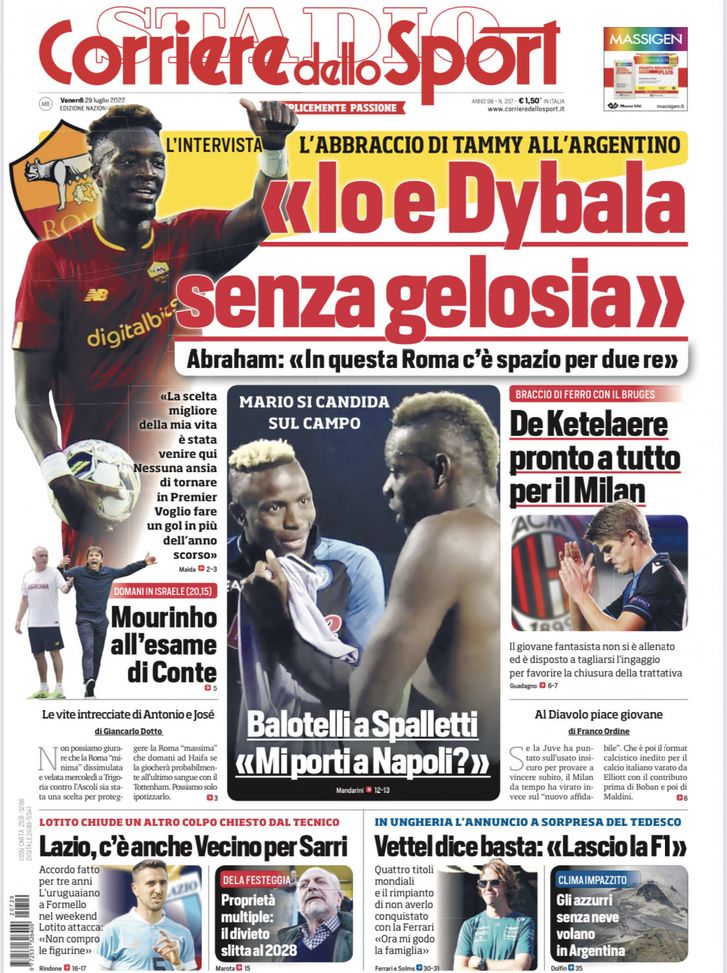 Il 'Corriere dello Sport' oggi in edicola, in prima pagina, apre con un'intervista a Tammy Abraham, centravanti della Roma di José Mourinho, che pregusta già una super coppia in attacco con il nuovo arrivato, Paulo Dybala. Intanto, domani sera in Israele, amichevole per i giallorossi contro il Tottenham Hotspur di Antonio Conte. Mentre il giovane Charles De Ketelaere è pronto a tutto per vestire la maglia del Milan in questa sessione di calciomercato, arrivando persino a tagliarsi l'ingaggio, Mario Balotelli, bomber dell'Adana Demirspor, lancia un appello a Luciano Spalletti: vorrebbe vestire la casacca del Napoli. Un ex tecnico dei partenopei, oggi alla Lazio, ovvero Maurizio Sarri, ha chiesto ed ottenuto dal suo club di poter avere Matías Vecino. Accordo triennale, l'uruguaiano ex Inter e Fiorentina sarà a Formello nel weekend.