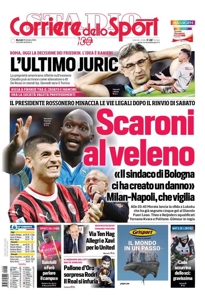 Il 'Corriere dello Sport' oggi in edicola, in prima pagina, apre con le parole di Paolo Scaroni, Presidente del Milan, sul rinvio della partita dello scorso weekend di campionato a Bologna: il club rossonero pensa di adire a vie legali per il danno creato alla società dall'ordinanza del Sindaco della città emiliana.