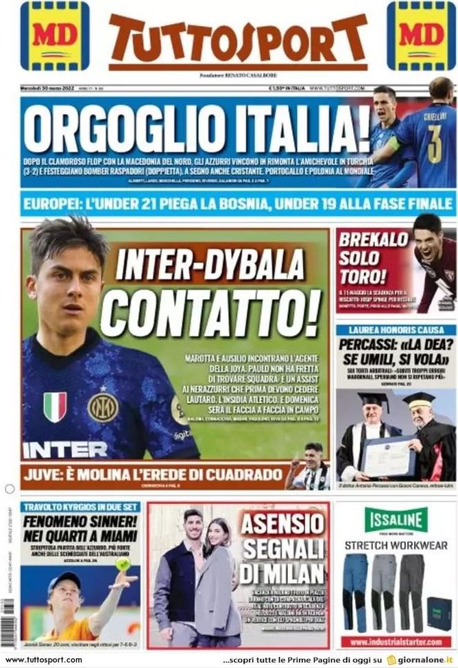 Infine, 'Tuttosport' oggi in edicola, in prima pagina, apre parlando del futuro di Paulo Dybala. I dirigenti dell'Inter incontrano il manager dell'attaccante argentino, il quale, corteggiato anche dalle big della Liga, non ha fretta di trovare squadra. 'Assist', questo, ai nerazzurri che prima dovranno cedere Lautaro Martínez. La Juventus ha individuato in Nahuel Molina dell'Udinese l'erede di Juan Cuadrado, mentre il Torino di Urbano Cairo ha già iniziato le grandi manovre per riscattare, nel corso del prossimo calciomercato estivo, l'esterno offensivo croato Jošip Brekalo dal Wolfsburg. In casa Milan, invece, 'folle' idea Marco Asensio, in uscita dal Real Madrid (scadenza di contratto 30 giugno 2023): il giocatore, in questi giorni, è stato in vacanza a Milano. Chiosa con i risultati della Nazionale Italiana: vittoria, 3-2, degli Azzurri di Roberto Mancini nell'amichevole contro la Turchia. Successi anche per Under 21 (1-0) sulla Bosnia e Under 19 (2-0) sul Belgio: quest'ultima selezione si qualifica per gli Europei di categoria.