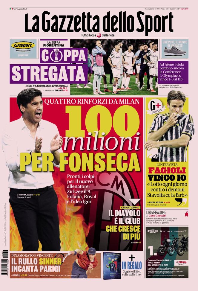 'La Gazzetta dello Sport' apre con il Milan e i quattro rinforzi che verranno fatti nel caso in cui sulla panchina dovesse arrivare Paulo Fonseca. Se tre di questi sono colpi già 'annunciati' o nomi già fatti, c'è anche un profilo a sorpresa. Spazio, poi, anche alla Juventus con l'intervista a Nicolò Fagioli dopo quanto avvenuto nel caso scommesse.