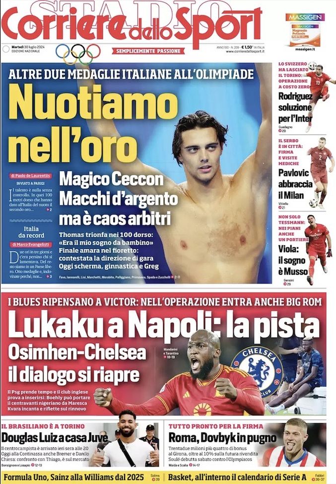 Il 'Corriere dello Sport' oggi in edicola, in prima pagina, parla dei movimenti di calciomercato del Napoli e, in particolare, della riapertura della trattativa per la cessione di Victor Osimhen al Chelsea. Nell'operazione potrebbe rientrare anche il cartellino di Romelu Lukaku, il centravanti gradito dal nuovo allenatore Antonio Conte. Intanto, Khvicha Kvaratskhelia incanta già in amichevole ma riflette sul rinnovo del suo contratto.