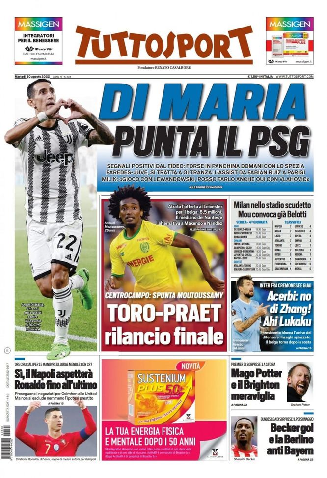 Infine, 'Tuttosport' oggi in edicola, in prima pagina, apre parlando delle condizioni fisiche di Ángel Di María. L'attaccante argentino, classe 1988, infortunatosi in occasione della prima giornata di campionato contro il Sassuolo, punta a rientrare nella sfida contro il PSG, esordio dei bianconeri in questa edizione della Champions League. Sarebbe una partita particolare per il 'Fideo', che a Parigi ha giocato nelle ultime sette stagioni. Spazio, poi, a tanto calciomercato. Il Torino rilancia per Dennis Praet del Leicester City, nell'ultima stagione proprio in maglia granata. Per il centrocampo, però, spunta anche Samuel Moutoussamy del Nantes. Stop di Steven Zhang, Presidente dell'Inter, all'arrivo di Francesco Acerbi in nerazzurro, a meno che non si concretizzino due cessioni in queste ultime ore: questione di monte ingaggi troppo elevato. Il Napoli aspetterà fino all'ultimo Cristiano Ronaldo: non si esclude neanche un prestito dal Manchester United, operazione slegata dal trasferimento di Victor Osimhen. Chiosa con l'estero: lode al Brighton di Graham Potter e all'Union Berlino dove fa sempre gol Sheraldo Becker.
