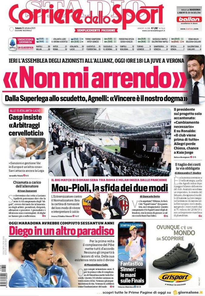 Il 'Corriere dello Sport' oggi in edicola, in prima pagina, apre con le dichiarazioni di Andrea Agnelli, Presidente della Juventus, all'Assemblea degli Azionisti del club bianconero. Il patron juventino a 360°, dalla SuperLega alla lotta per il titolo. Dichiarazioni al vetriolo, quindi di Gian Piero Gasperini, tecnico dell'Atalanta, sugli arbitraggi delle ultime gare e sull'utilizzo del V.A.R. da parte dei direttori di gara. Si parla, infine, di Roma-Milan, posticipo dell'11^ giornata di Serie A, con la sfida in panchina tra José Mourinho e Stefano Pioli e del compleanno di Diego Armando Maradona, che era nato a Lanús il 30 ottobre 1960.
