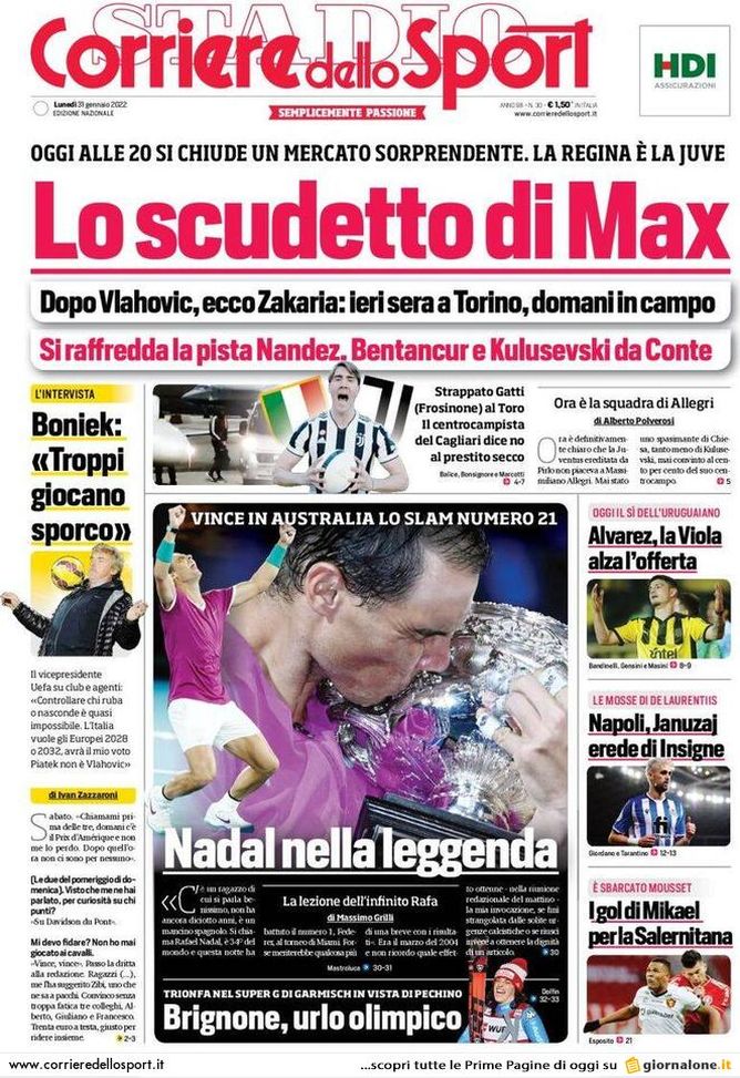 Il 'Corriere dello Sport' oggi in edicola, in prima pagina, apre parlando della Juventus di Massimiliano Allegri, regina indiscussa della sessione invernale di calciomercato. Rinforzato l'attacco con Dušan Vlahović, i bianconeri hanno preso anche Denis Zakaria per il centrocampo. Acquistato, per la difesa, Federico Gatti (ma resterà al Frosinone in prestito fino al termine di questa stagione). Si raffredda la pista Nahitan Nández, che non vorrebbe muoversi in prestito secco. Intanto, ceduti Dejan Kulusevski e Rodrigo Bentancur al Tottenham. La Fiorentina alza la sua offerta per Agustín Álvarez, attaccante del Peñarol, il Napoli punta Adnan Januzaj come erede di Lorenzo Insigne mentre la Salernitana ha acquistato Lys Mousset e Mikael. Intervista, quindi, a Zbigniew Boniek, Presidente della Federcalcio polacca.