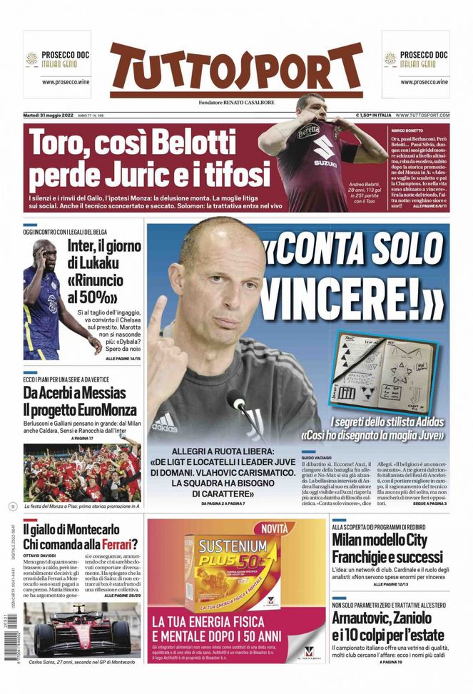 Infine, 'Tuttosport' oggi in edicola, in prima pagina, apre con le dichiarazioni di Massimiliano Allegri, tecnico della Juventus, che investe del ruolo di leader bianconeri del domani il difensore Matthijs de Ligt e il centrocampista Manuel Locatelli. L'attaccante Dušan Vlahović è definito 'carismatico'. Per l'allenatore, però, questa Juve ha bisogno di carattere. In alto, sotto la testata, si parla di Andrea Belotti, in scadenza di contratto con il Torino, che non ha ancora preso una decisione sul suo futuro. Tirandola alle lunghe sul rinnovo, rischia di perdere l'appoggio del tecnico Ivan Jurić e dei tifosi granata. L'Inter spera di riprendersi Romelu Lukaku dal Chelsea ed oggi vede i legali del belga: il giocatore è disposto a rinunciare al 50% dell'ingaggio, ma potrebbe arrivare soltanto in prestito. Il Monza, appena promosso in Serie A, sogna in grande. Punta Mattia Caldara e Junior Messias (Milan), Francesco Acerbi (Lazio), Stefano Sensi e Andrea Ranocchia (Inter). Si parla, poi, dell'arrivo di RedBird alla guida del Milan e dei piani che hanno gli statunitensi per il club rossonero. In chiusura, i 10 colpi dell'estate di mercato.
