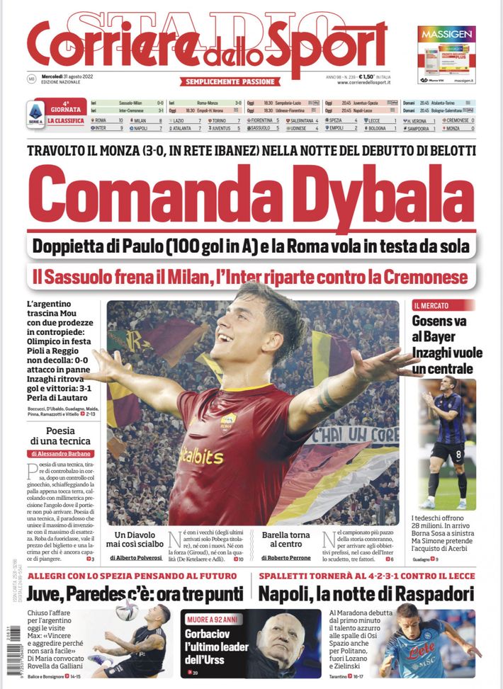 Il 'Corriere dello Sport' oggi in edicola, in prima pagina, apre celebrando Paulo Dybala, attaccante della Roma, che ha segnato i suoi primi due gol in giallorosso ieri in occasione della vittoria per 3-0 sul Monza. Per la 'Joya', quota 100 reti in Serie A. Nella fila della squadra di José Mourinho debutto anche per il 'Gallo' Andrea Belotti. L'Inter riparte battendo 3-1 la Cremonese a 'San Siro', mentre frena il Milan, inchiodato sullo 0-0 al 'Mapei Stadium' di Reggio Emilia contro il Sassuolo. In Napoli-Lecce il tecnico azzurro Luciano Spalletti torna al 4-2-3-1 e lancia Giacomo Raspadori dal 1', poi c'è anche Juventus-Spezia: i bianconeri cercheranno di tornare ai tre punti dopo che Leandro Paredes, preso dal PSG, avrà svolto le visite mediche al 'J-Medical'. Chiosa con il calciomercato. L'Inter ha detto di sì alla proposta del Bayer Leverkusen per Robin Gosens (prestito oneroso con obbligo di riscatto per un totale di 28 milioni di euro). In arrivo, per sostituirlo, Borna Sosa dallo Stoccarda, ma Simone Inzaghi pretende anche l'acquisto di un difensore centrale.