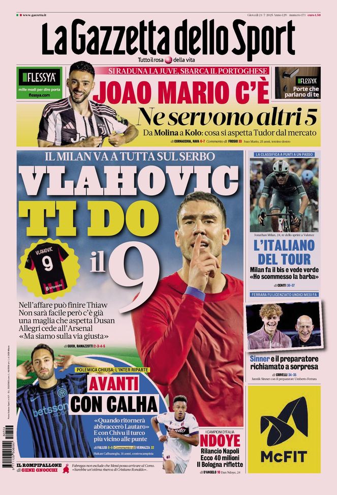 'La Gazzetta dello Sport' oggi in edicola, in prima pagina, apre parlando del Milan e della volontà dei rossoneri di prendere Dušan Vlahović dalla Juventus in questa sessione estiva di calciomercato. Nell'operazione potrebbe finire Malick Thiaw. I rossoneri, che perdono 0-1 in amichevole contro l'Arsenal, pronti a dare al serbo la maglia numero 9.