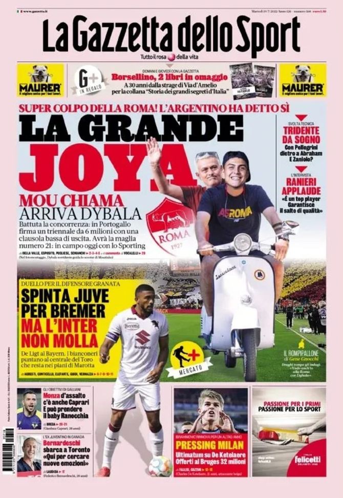 'La Gazzetta dello Sport' oggi in edicola, in prima pagina, apre con il trasferimento di Paulo Dybala alla Roma, che andrà a formare un tridente da sogno con Abraham e Zaniolo. Intanto la Juventus, per sopperire all'addio di De Ligt, è pronta a piombare prepotentemente su Gleison Bremer.
