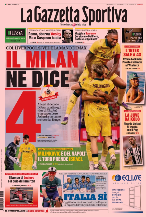 'La Gazzetta dello Sport' oggi in edicola, in prima pagina, apre con la vittoria del Milan contro il Liverpool. Il Milan ne dice 4. Allegri al decollo. Milinkovic è del Napoli. Il Torino prende Israel. La Juventus da Kolo Muani. L'Inter sale a 43 per Lookman. PROSSIMA SCHEDA